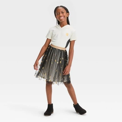 Add some fun feline flair to your child’s wardrobe with this Squishmallows Cat Hooded Dress. The pullover dress features a white short-sleeve bodice with a tiny cat patch on the chest inscribed with the letter “S” and an attached hood with Cam’s face and 3D ears in brown and black. The flouncy knee-length white skirt is designed with a black mesh overlay that’s embellished with gold foil star and musical note motifs plus a shiny glitter waistband and a 3D tail detail in black and brown at the back.