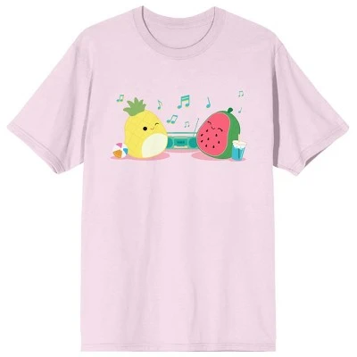 Jam out with your favorite Squishmallows tee. The shirt features an image of Maui the Pineapple and Wanda the Watermelon dancing to music from the radio. The tee comes in a cradle pink short sleeve crew neck. Fans of the Squishmallows will love this comfy cotton t-shirt.