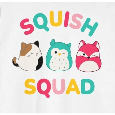 Join the Squish Squad with this Squishmallows tee. The shirt features an image of Cam the Cat, Winston the Owl, and Fifi the Fox while rainbow letters spell out, “Squish Squad.” The tee comes in a white short sleeve crew neck. Fans of the Squishmalllows will love this comfy cotton t-shirt.