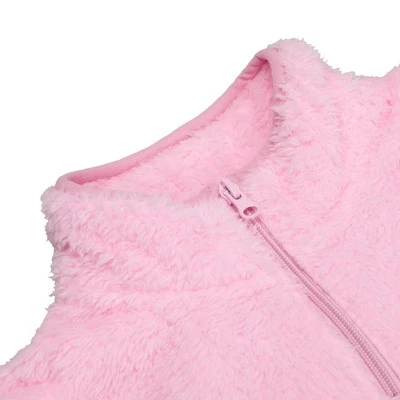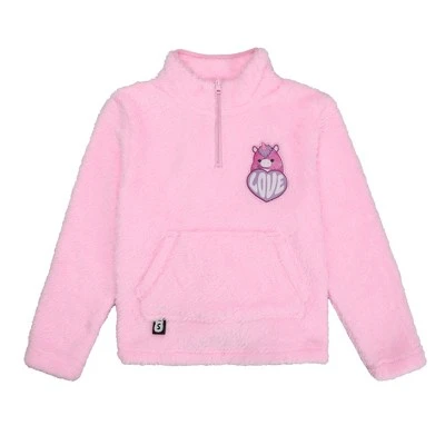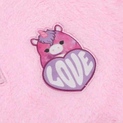 Stay warm and cozy while you celebrate your favorite Squishmallows with this faux shearling pullover. The jacket comes in pink with a kangaroo pocket and features a patch of Lola the unicorn on a purple heart with white letters that spell out, “Love.” Squishmallows fans will love this comfy and cozy pullover.